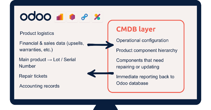 By building a CMDB within their Odoo ERP, businesses can integrate granular product tracking with their standard business processes like sales, maintenance, and accounting.